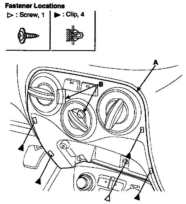 2. After loosen the center facia lower panel mounting screw, remove the center facia lower panel (A). Disconnect the heater control unit connector (B).