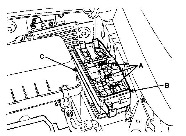 4. Remove the IPM (B) from the splash shield (C) after loosening the 3 IPM mounting bolts (A) and the IPM mounting clip.