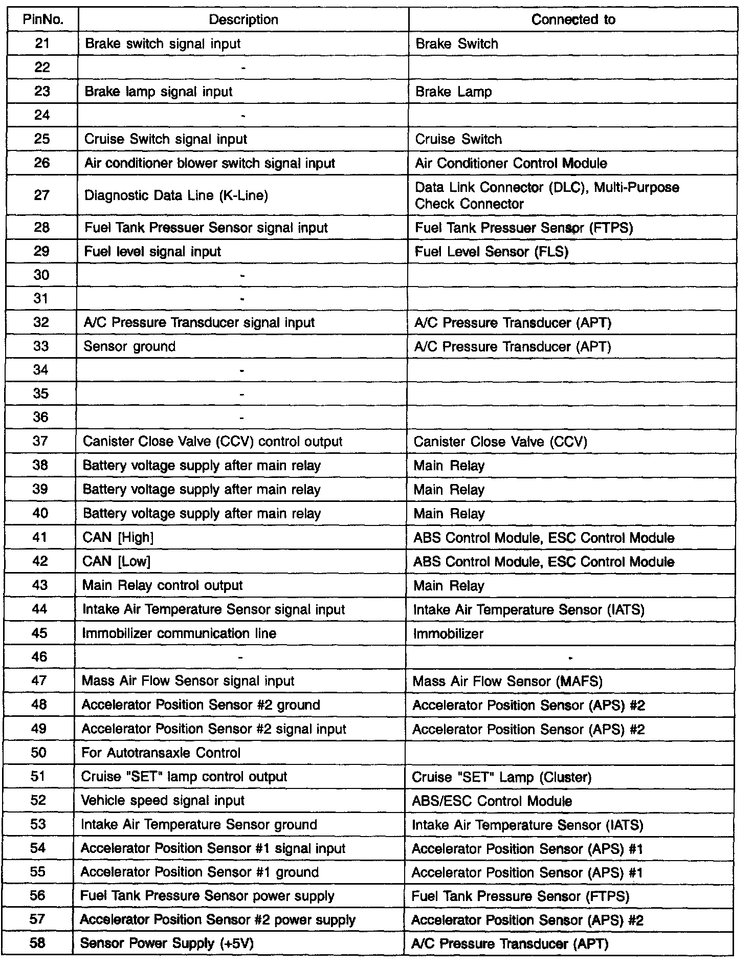 PCM Terminal Function - Connector (CO1-1)