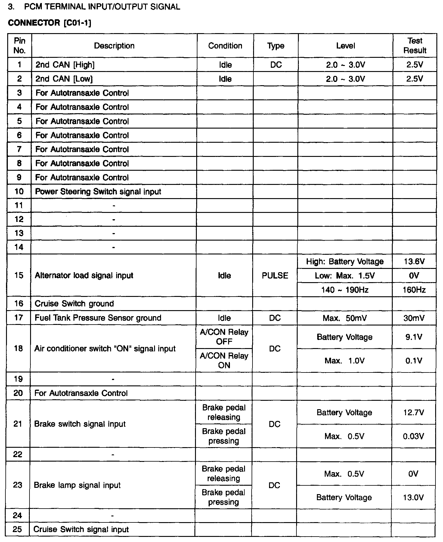 PCM Terminal Input/Output Signal - Connector (C01-1)