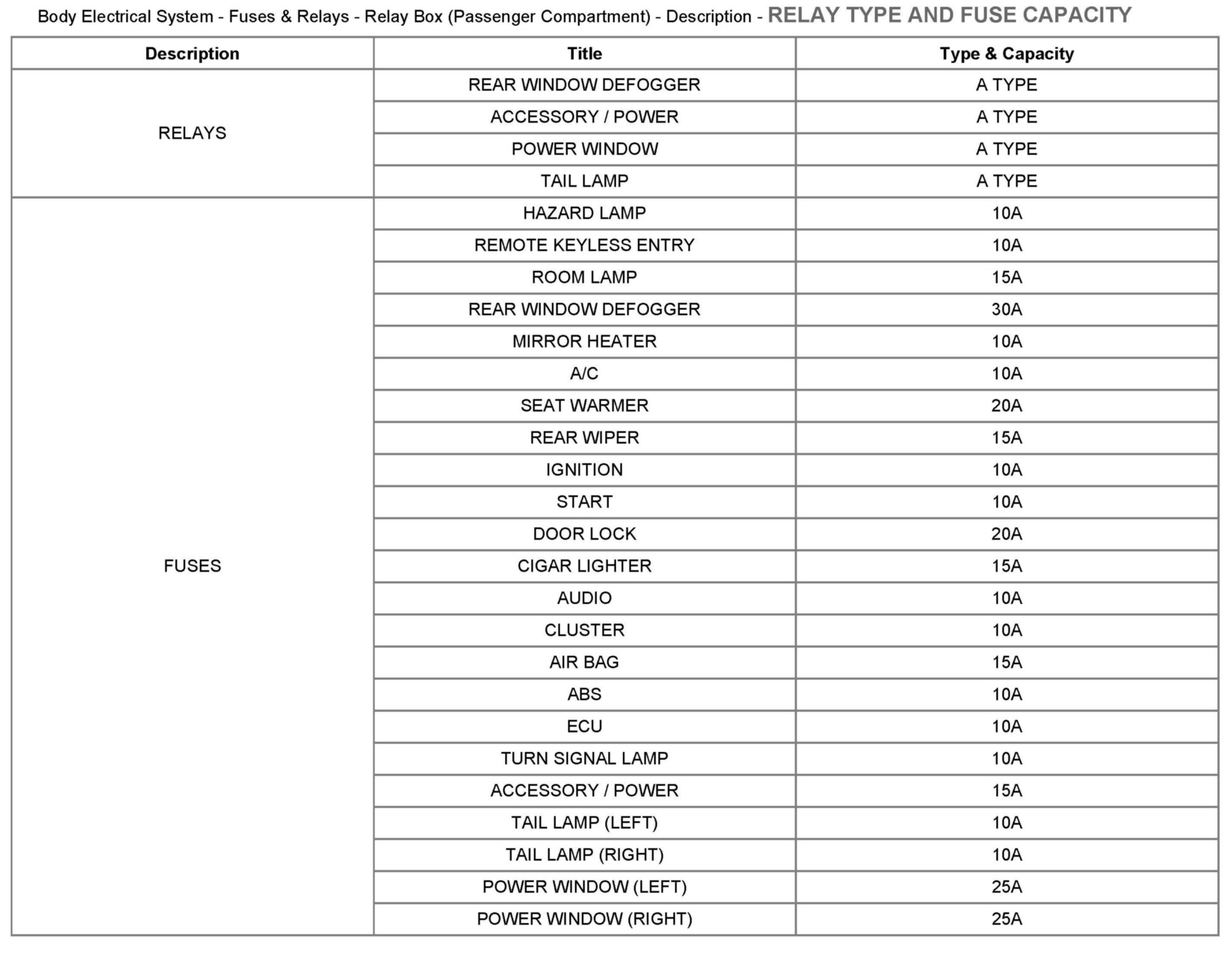 Relay Type And Fuse Capacity: