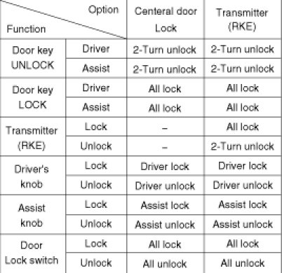 (2) Driver door unlock signal is output for T2 when RKE UNLOCK signal is received. But, all door unlock signals are output for T2 if RKE UNLOCK signal is received within T1.
