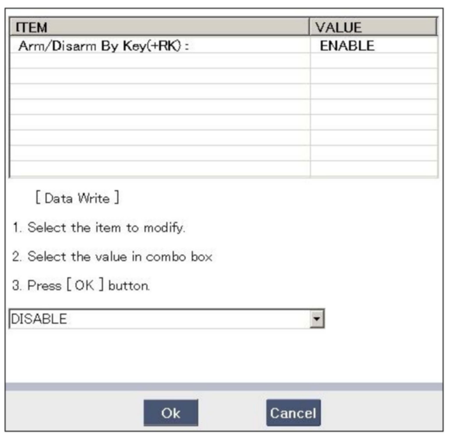 ARM/DISARM BY KEY(+RK): Allows the ability to arm/disarm the factory alarm using the door key. This option can be enabled/disabled using the GDS as shown below.