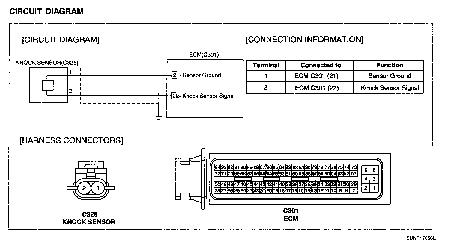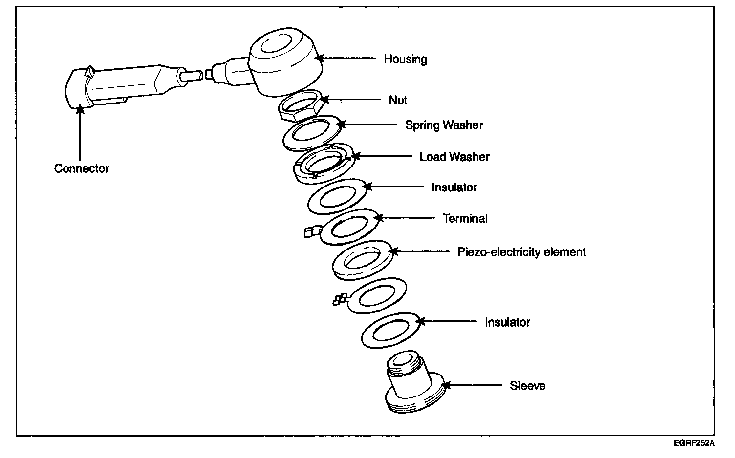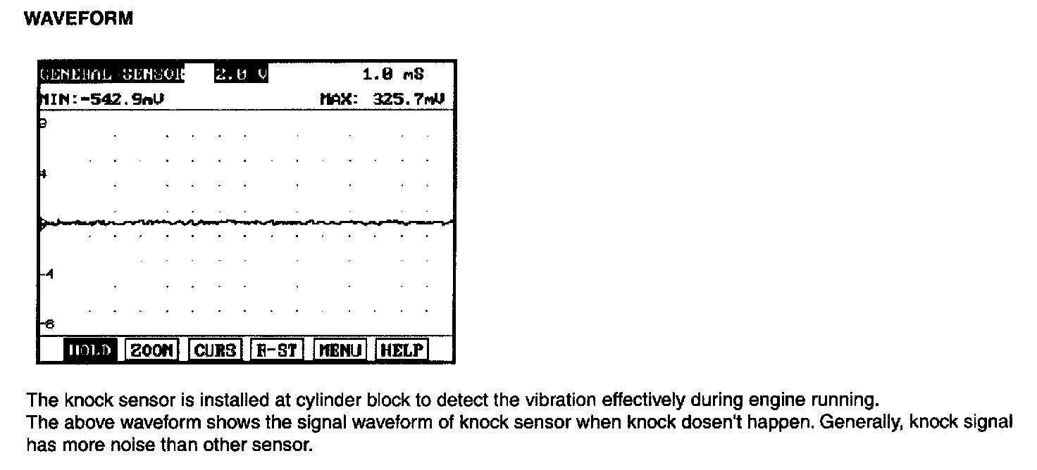 Knocking is a phenomenon characterized by undesirable vibration and noise and can cause engine damage. Knock Sensor (KS) senses engine knocking and the cylinder block. When knocking occurs, the vibration from the cylinder block is applied as pressure to the piezoelectric element. At this time, this sensor transfers the voltage signal higher than the specified value to the ECM and the ECM retards the ignition timing. If the knocking disappears after retarding the ignition timing, the ECM will advance the ignition timing. This sequential control can improve engine power, torque and fuel economy.