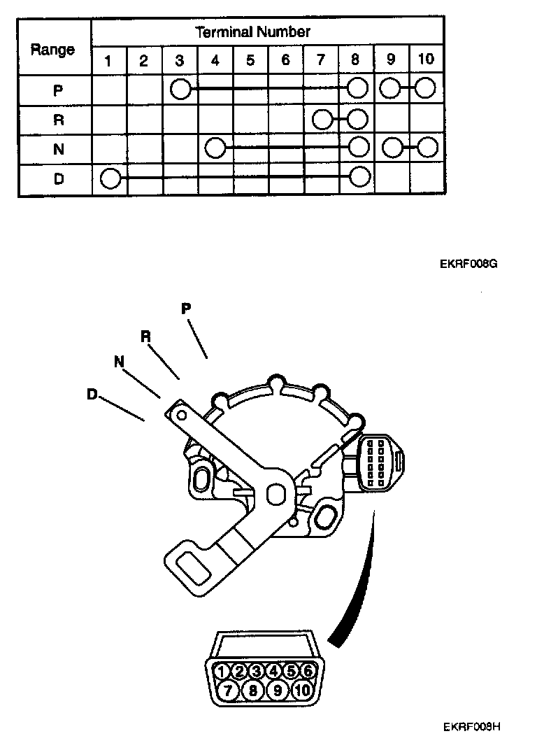 9. If there is not continuity between the terminals in the table above for each switch position, replace the inhibitor switch.