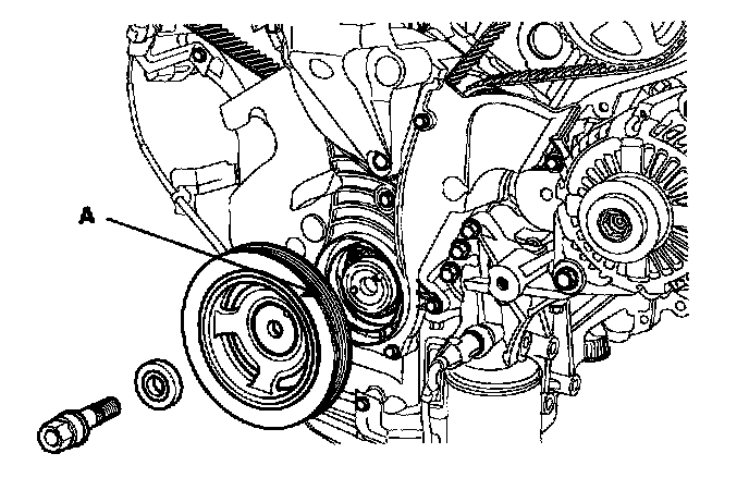 4. Remove the drive belt(A), the idler(B) and the tensioner(C).