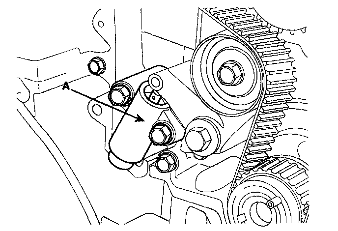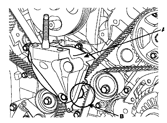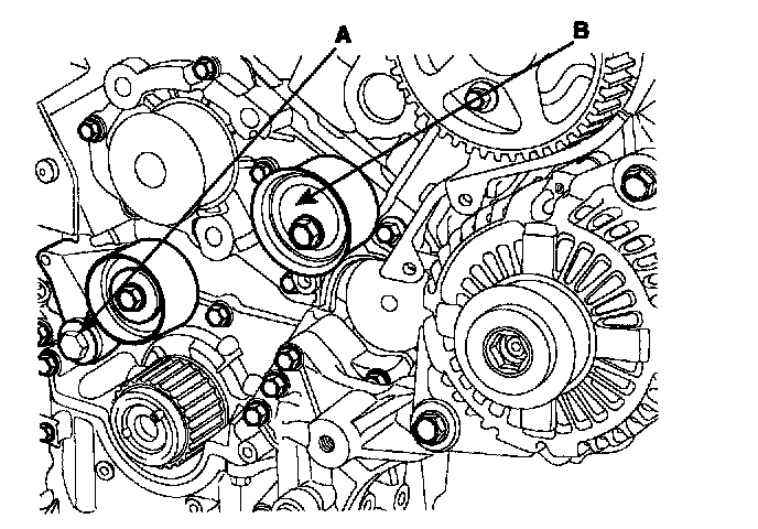 2. Install the tensioner arm assembly(A) and the idler(B).