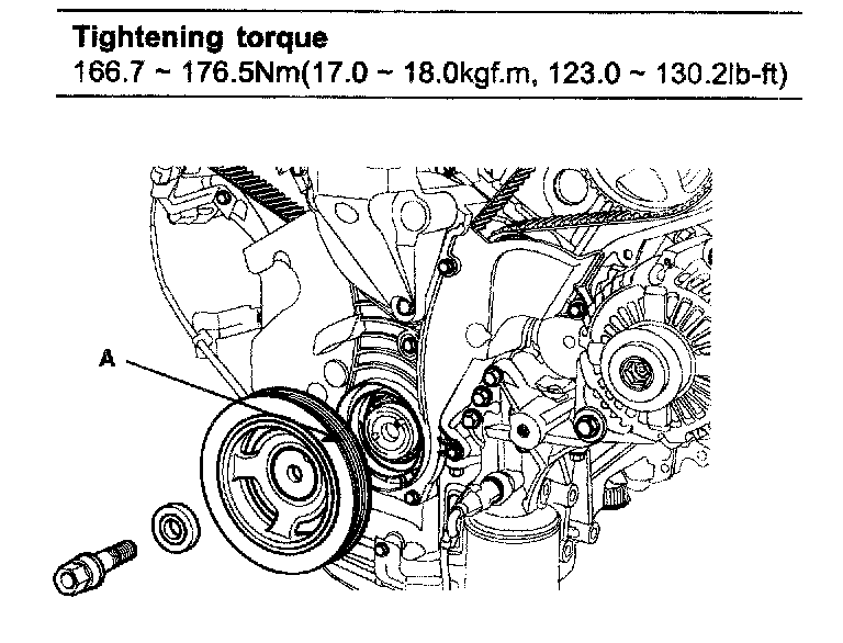 6. Align the groove of the pulley with the timing mark of the timing belt cover by turning the crankshaft pulley clockwise. Check if the timing mark of the camshaft sprocket is aligned with that of the cylinder head cover.