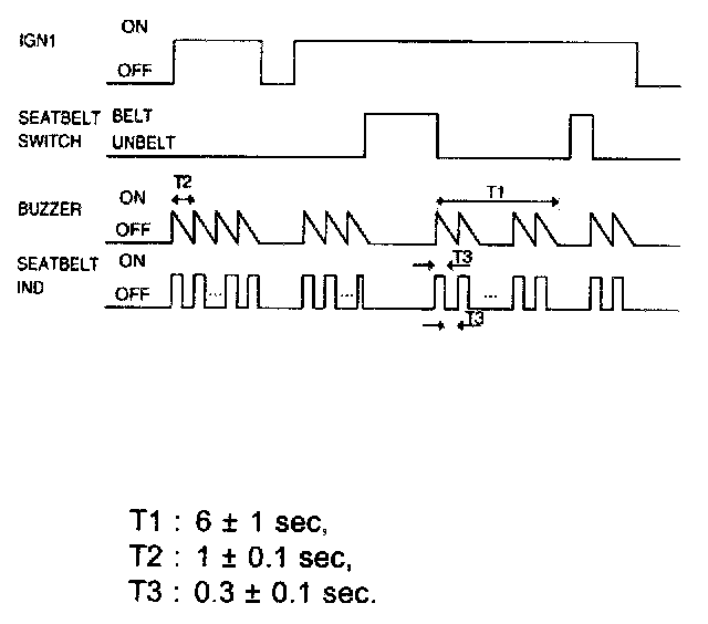 1. When IGN1 ON & SEAT BELT is not being worn, WARNING IND is blinking as cycle of 0.6 s and BUZZER is outputting for 6 s
