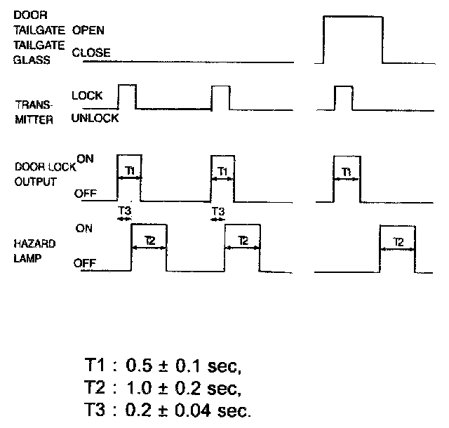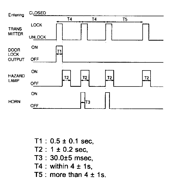 a. In case of removing IGN KEY from CYLINDER and all Door is CLOSE, when receiving TRANSMITTER LOCK signal, start the operation of LOCK output and after T3 from the starting point of operation and then checking the state of LOCK SWITCH, ON the output of HAZARD LAMP for 1 s one time.