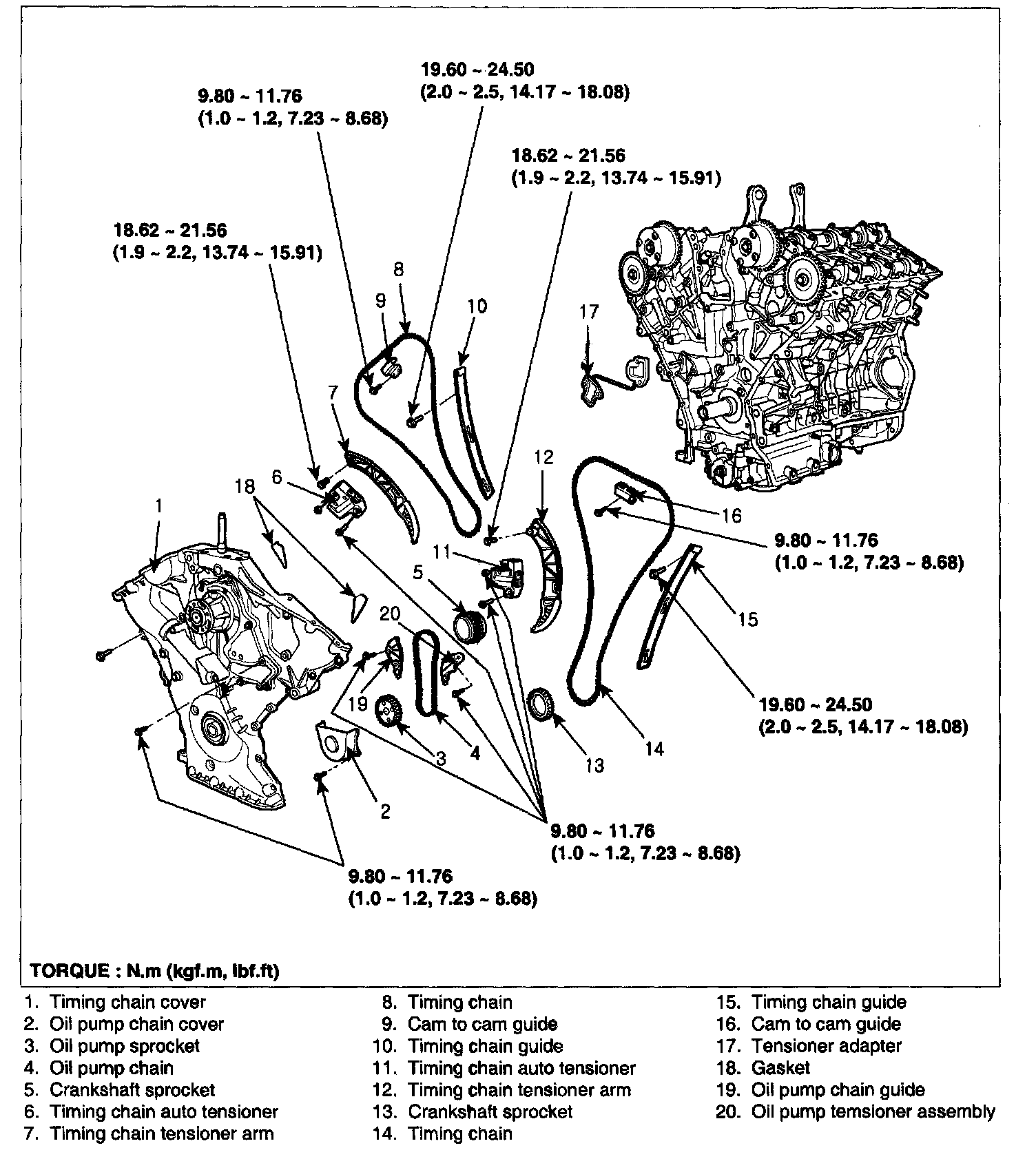 Timing chain auto tensioner bolt (2) 9.80 - 11.76 Nm (1.0 - 1.2 kgf.m, 7.23 - 8.68 lb.ft)