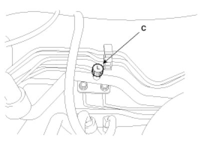 Recovery/Recycling/Charging System (A) to the high-pressure service port (B) and the low-pressure service port (C) as shown, following the equipment manufacturer's instructions.