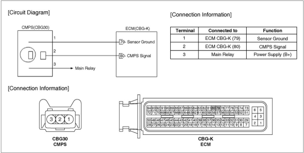 Camshaft Position Sensor (CMPS) is a hall sensor and detects the camshaft position by using a hall element. It is related with Crankshaft Position Sensor (CKPS) and detects the piston position of each cylinder which the CKPS can't detect. The CMPS are installed on engine head cover and uses a target wheel installed on the camshaft. This sensor has a hall-effect IC which output voltage changes when magnetic field is made on the IC with current flow.