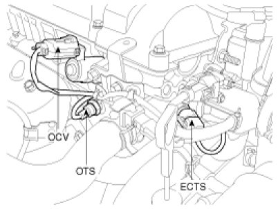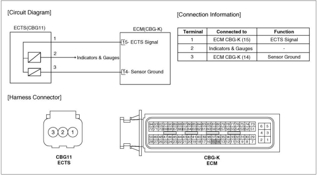 Engine Coolant Temperature Sensor (ECTS) is located in the engine coolant passage of the cylinder head for detecting the engine coolant temperature. The ECTS uses a thermistor whose resistance changes with the temperature. The electrical resistance of the ECTS decreases as the temperature increases, and increases as the temperature decreases. The reference 5 V in the PCM is supplied to the ECTS via a resistor in the PCM.That is, the resistor in the PCM and the thermistor in the ECTS are connected in series. When the resistance value of the thermistor in the ECTS changes according to the engine coolant temperature, the output voltage also changes. During cold engine operation the PCM increases the fuel injection duration and controls the ignition timing using the information of engine coolant temperature to avoid engine stalling and improve drivability.