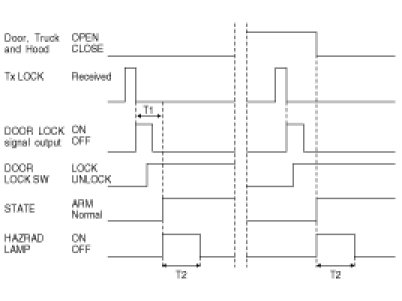 (1) Under DOOR, TRUNK or HOOD: closed, horn and hazard(1s-output) signals are output if RKE LOCK signal is received again within T1 from the moment when the system transits to ARM mode by RKE LOCK operation and ARM mode is kept.