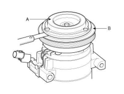 Measure the clearance between the pulley (B) and the disc & hub assembly (A) all the way around. If the clearance is not within specified limits, remove the disc & hub assembly and add or remove shim (gap washer) as needed to increase or decrease clearance.Clearance : 0.45 ± 0.1mm (0.018 ± 0.004 in.)