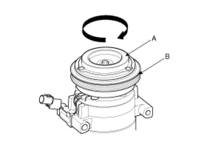 2. Check the pulley (B) bearing play and drag by rotating the pulley by hand. Replace the clutch set with a new one if it is noisy or has excessive play/drag.