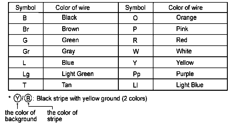 The following abbreviations are used to identify wire colors in the circuit schematics.