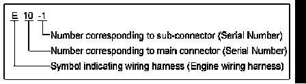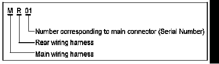 A connector identification symbol consists of a wiring harness location classification symbol corresponding to a wiring harness location and number corresponding to the connector.