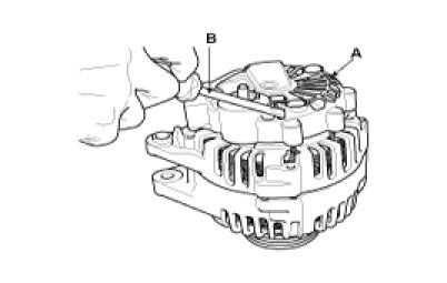 2. Loosen the mounting bolts(A) and disconnect the brush holder assembly(B).