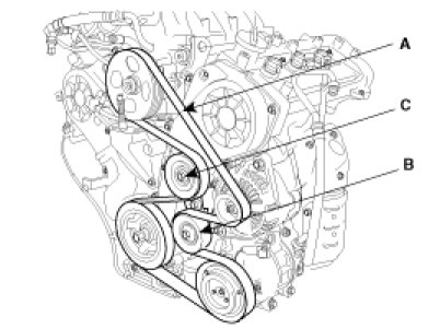 4. Remove the drive belt(A), the idler(B) and the tensioner(C).