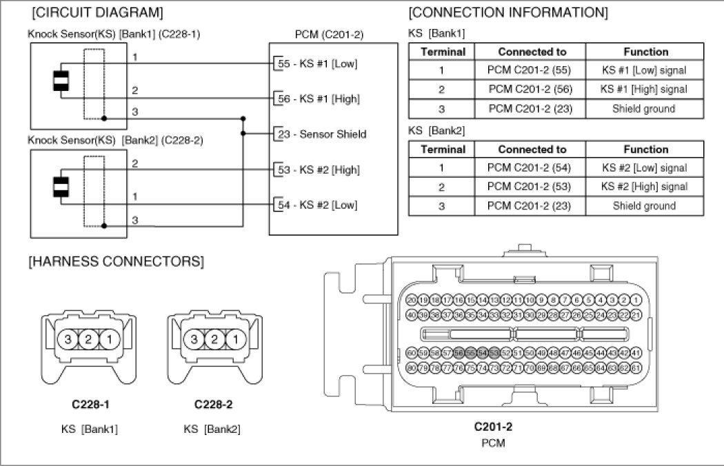 Knocking is a phenomenon characterized by undesirable vibration and noise and can cause engine damage. Knock Sensor (KS) senses engine knocking and the two sensors are installed inside the V-valley of the cylinder block. When knocking occurs, the vibration from the cylinder block is applied as pressure to the piezoelectric element. At this time, this sensor transfers the voltage signal higher than the specified value to the PCM and the PCM retards the ignition timing. If the knocking disappears after retarding the ignition timing, the PCM will advance the ignition timing. This sequential control can improve engine power, torque and fuel economy.
