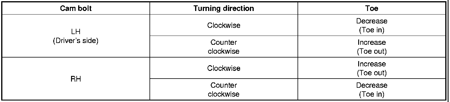 Camber is pre-set at the factory, so it does not need to be adjusted. If the camber is not within the standard value, replace or repair the damaged parts and then inspect again.