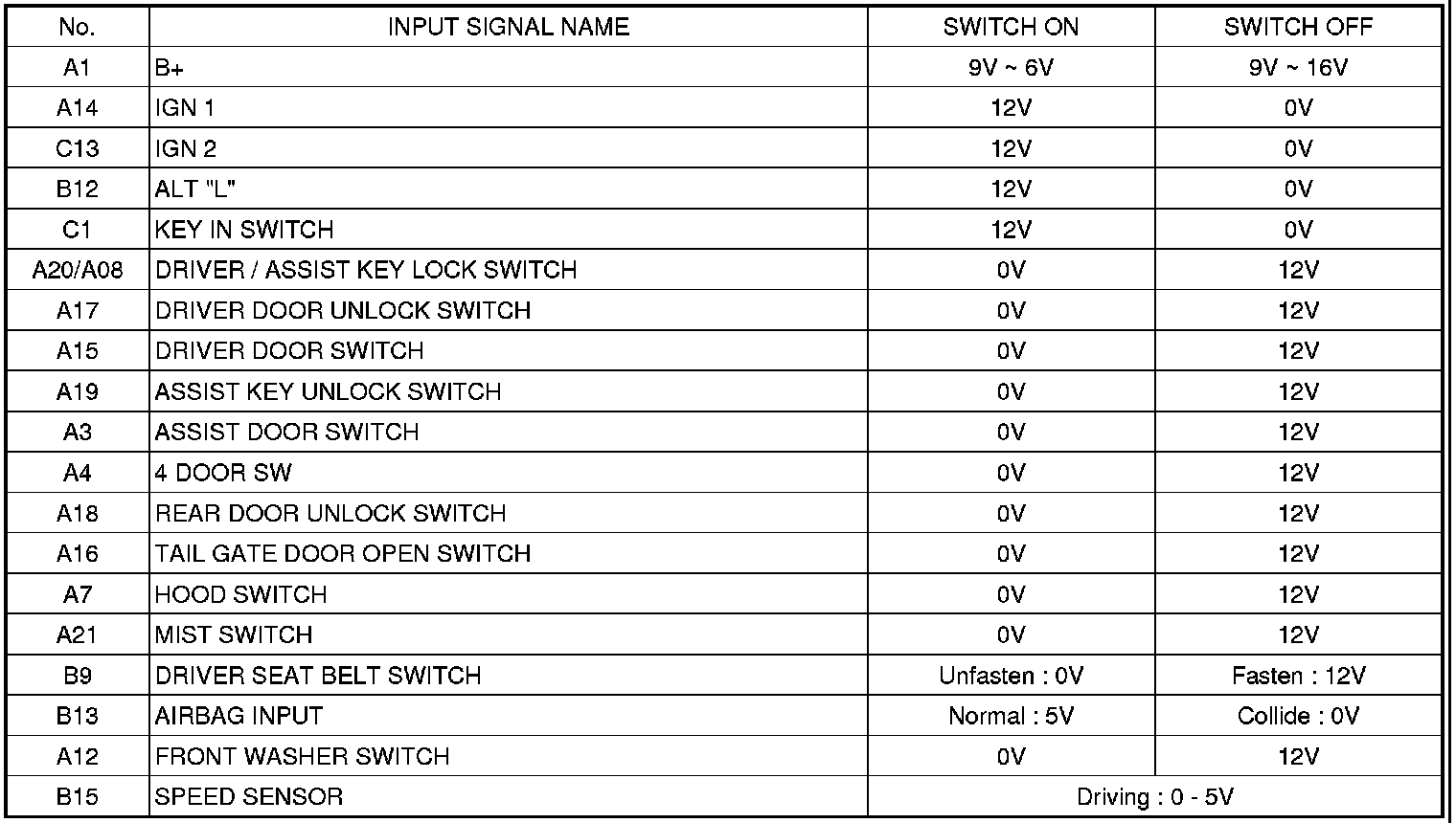 Pinout Values and Diagnostic Parameters