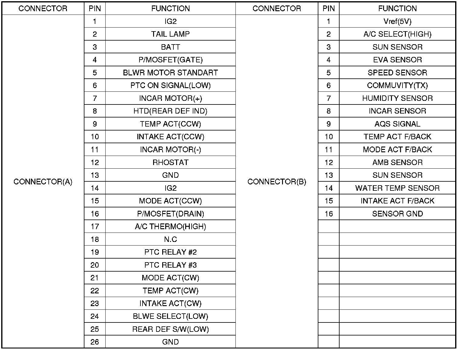 CONNECTOR PIN FUNCTION
