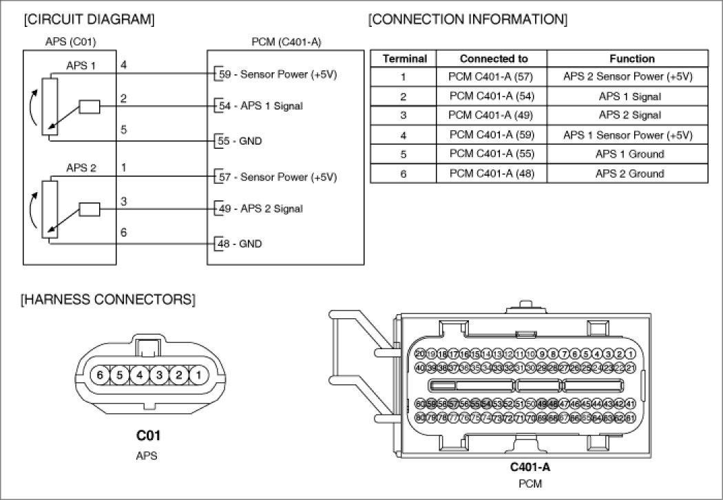 Accelerator Position Sensor (APS) is installed on the accelerator pedal module and detects the rotation angle of the accelerator pedal. The APS is one of the most important sensors in engine control system, so it consists of the two sensors which adapt individual sensor power and ground line. The second sensor monitors the first sensor and its output voltage is half of the first one. If the ratio of the sensor 1 and 2 is out of the range (approximately 1/2), the diagnostic system judges that a malfunction has occurred.