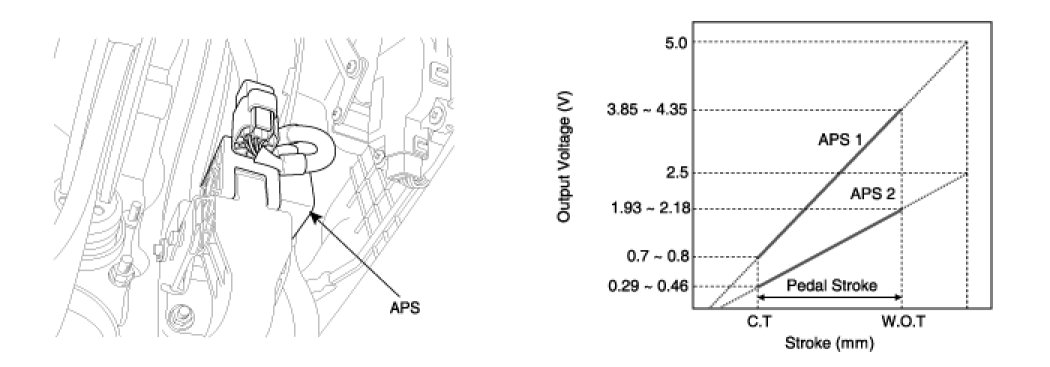 Accelerator Position Sensor (APS) is installed on the accelerator pedal module and detects the rotation angle of the accelerator pedal. The APS is one of the most important sensors in engine control system, so it consists of the two sensors which adapt individual sensor power and ground line. The second sensor monitors the first sensor and its output voltage is half of the first one. If the ratio of the sensor 1 and 2 is out of the range (approximately 1/2), the diagnostic system judges that a malfunction has occurred.