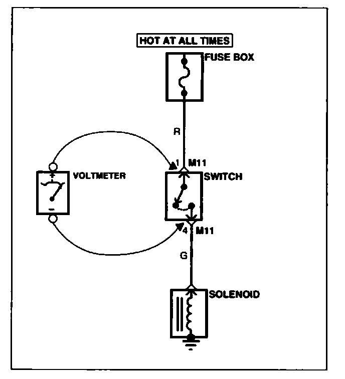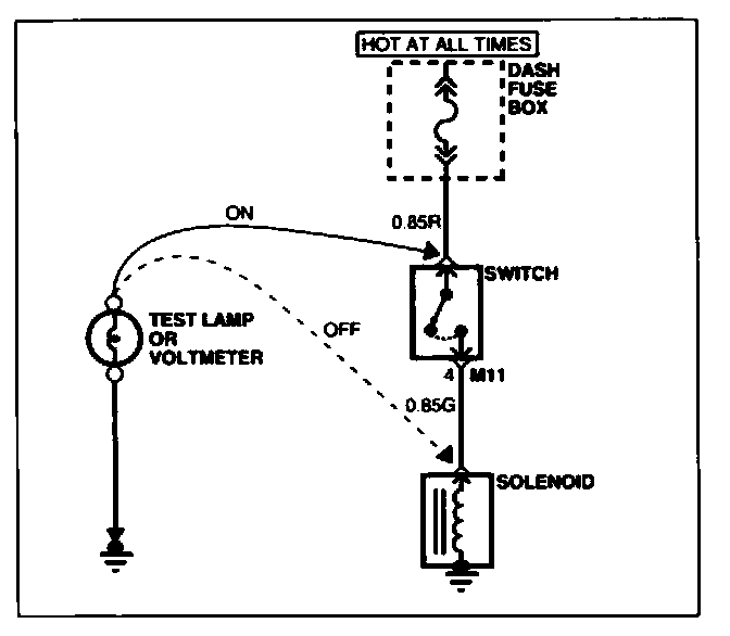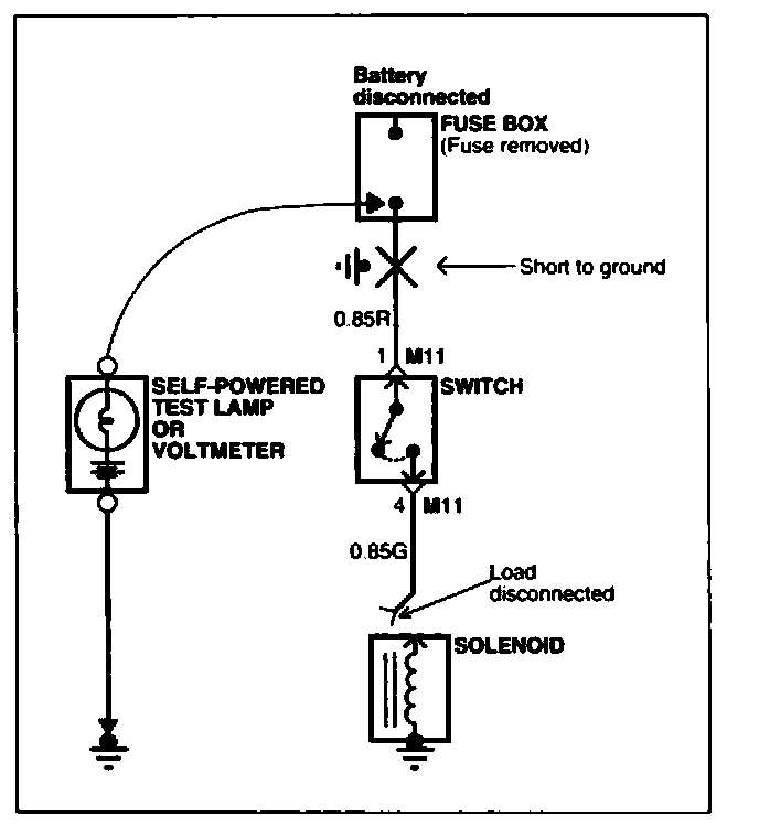 A. Connect one lead of a test lamp or voltmeter to a ground. If you are using a voltmeter, be sure it is the voltmeter's negative test lead you have connected to ground.