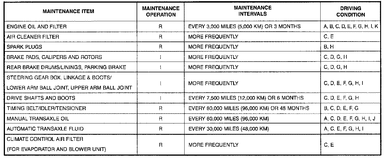 R: Replace. I: Inspect and, after inspection, clean, adjust, repair or replace if necessary.