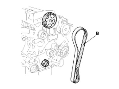 15. Remove the timing belt tensioner (A) and timing belt (B).