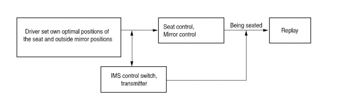 Seat and mirror positions set by the driver are memorized in the IMS control unit by the position sensors. So, those positions can be returned to the memorized positions by the IMS control switch and keyless control even when the seat and mirror positions are changed. (This is called replay operation). In addition, LIN communication is performed between power seat control unit and power window. For the sake of safety, replay is prohibited during driving and replay operation can be stopped immediately.
