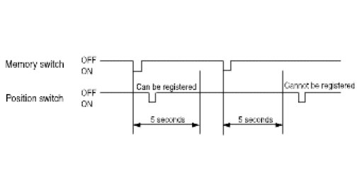 1. If the position switch is pressed within the 5 seconds after pressing the memory switch when the ignition is ON, then, current positions of the seat and mirror are registered. (Memory permits status lasts for 5 seconds after the memory switch is on, and the memory permit status is cleared thereafter. In other words, current position is registered only if the position switch is pressed in memory permit status.)