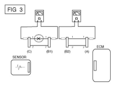 B. Disconnect connector (B), and measure for resistance between connector (C) and (B1) and between (B2) and (A) as shown in [FIG. 3].