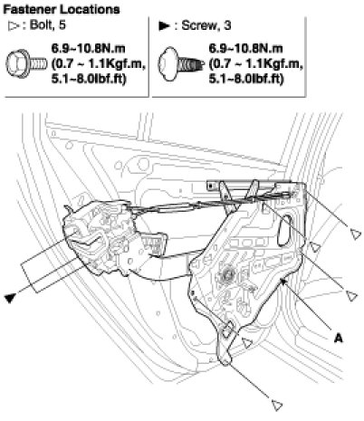 3. After loosening the door module mounting bolts, remove the door module (A).