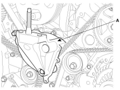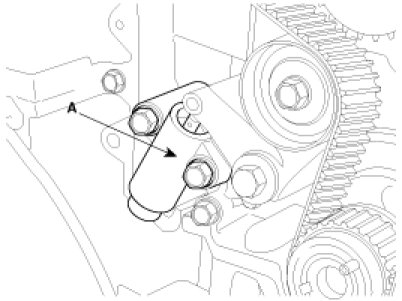 2. Install the tensioner arm assembly(A) and the idler(B).