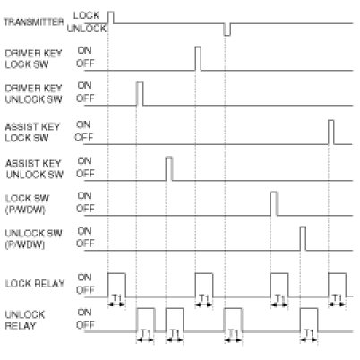 (4) After receiving TUNLOCK and DRIVER KEY UNLOCK SW is changed from OFF to ON within T1, ON the output of all DOOR UNLOCK for T2.
