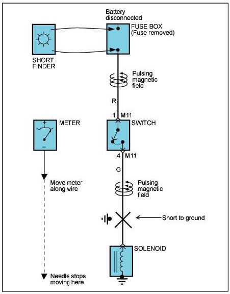 A short finder is available to locate a short to ground. The short finder creates a pulsing magnetic field in the shorted circuit and shows you the location of the short through body trim or sheet metal.