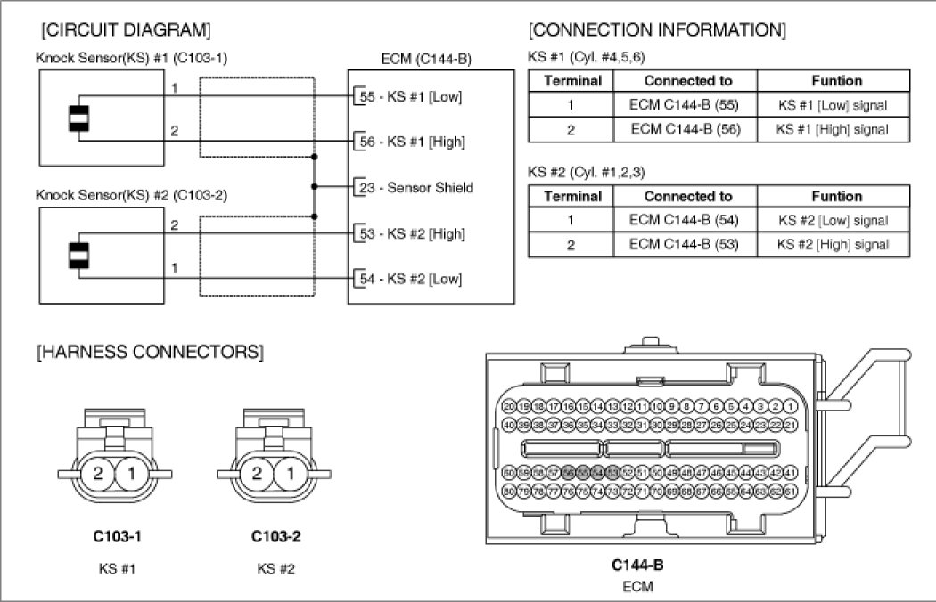 Knocking is a phenomenon characterized by undesirable vibration and noise and can cause engine damage. Knock Sensor (KS) senses engine knocking and the two sensors are installed inside the V-valley of the cylinder block. When knocking occurs, the vibration from the cylinder block is applied as pressure to the piezoelectric element. At this time, this sensor transfers the voltage signal higher than the specified value to the PCM and the PCM retards the ignition timing. If the knocking disappears after retarding the ignition timing, the PCM will advance the ignition timing. This sequential control can improve engine power, torque and fuel economy.