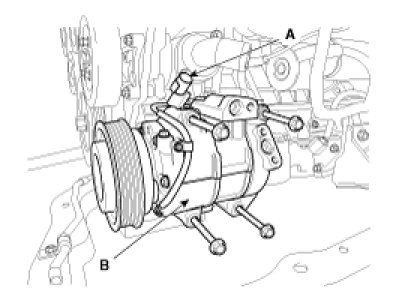 6. Disconnect the compressor clutch connector (A), and then remove 4 mounting bolts and the compressor.