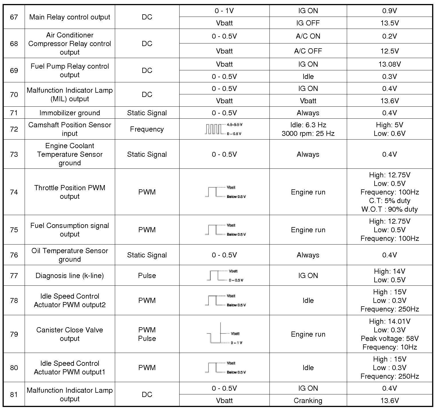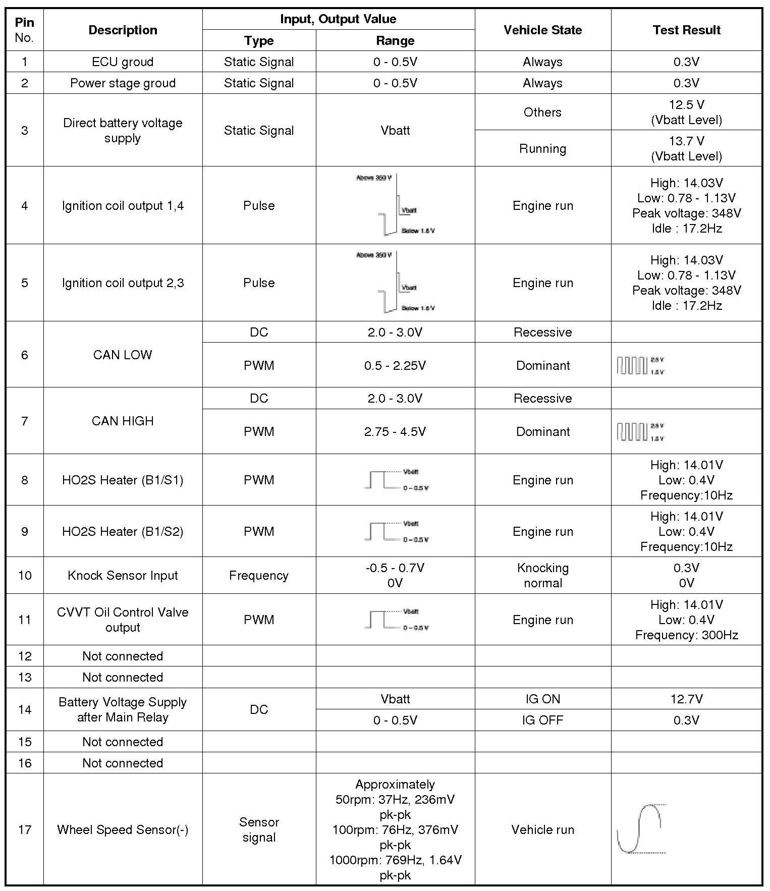 Pinout Values and Diagnostic Parameters