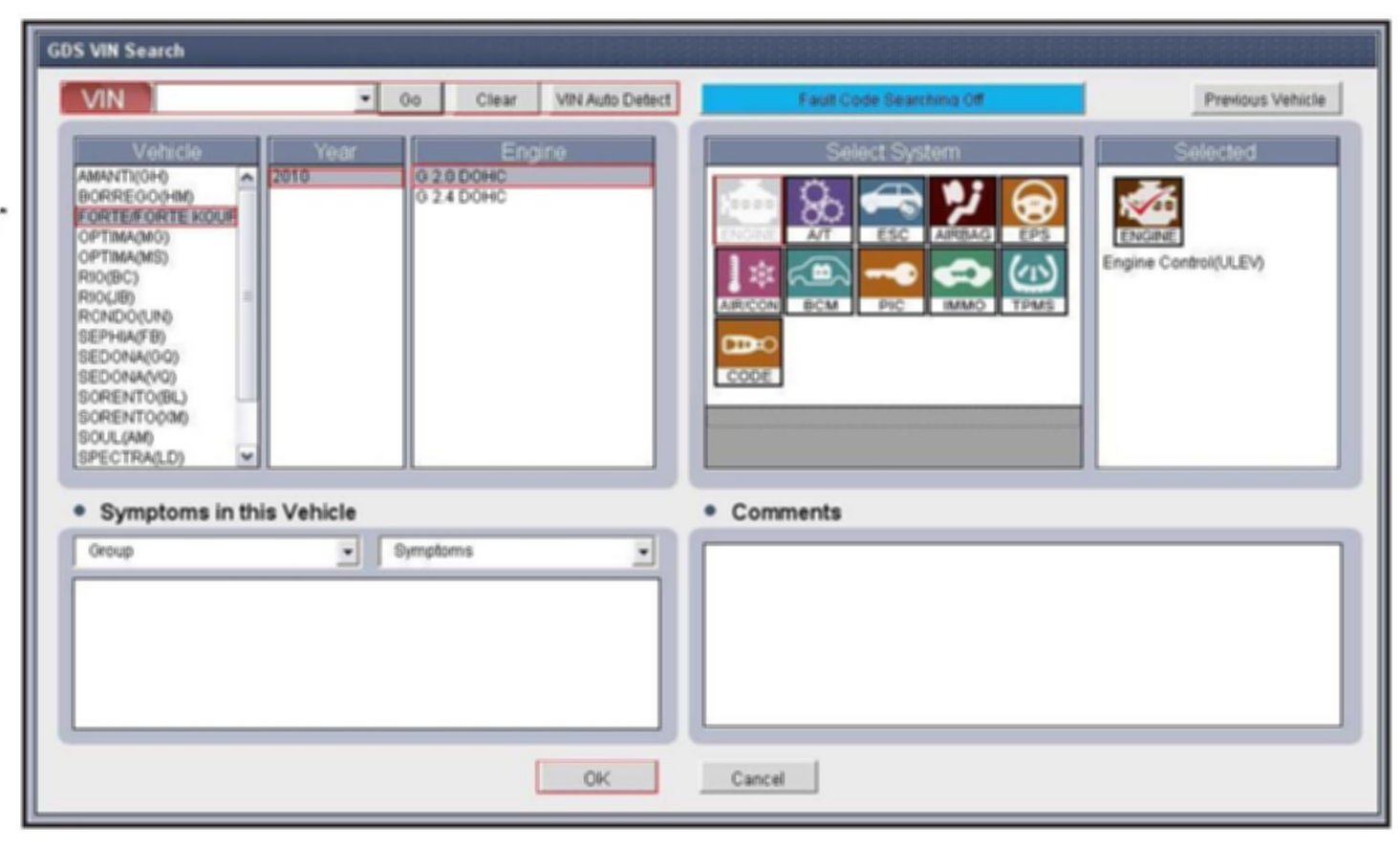 5. With the ignition key ON, turn ON the VCI and GDS tool. Access the GDS vehicle identification number (VIN) screen and configure the vehicle using the VIN AUTO DETECT Function.