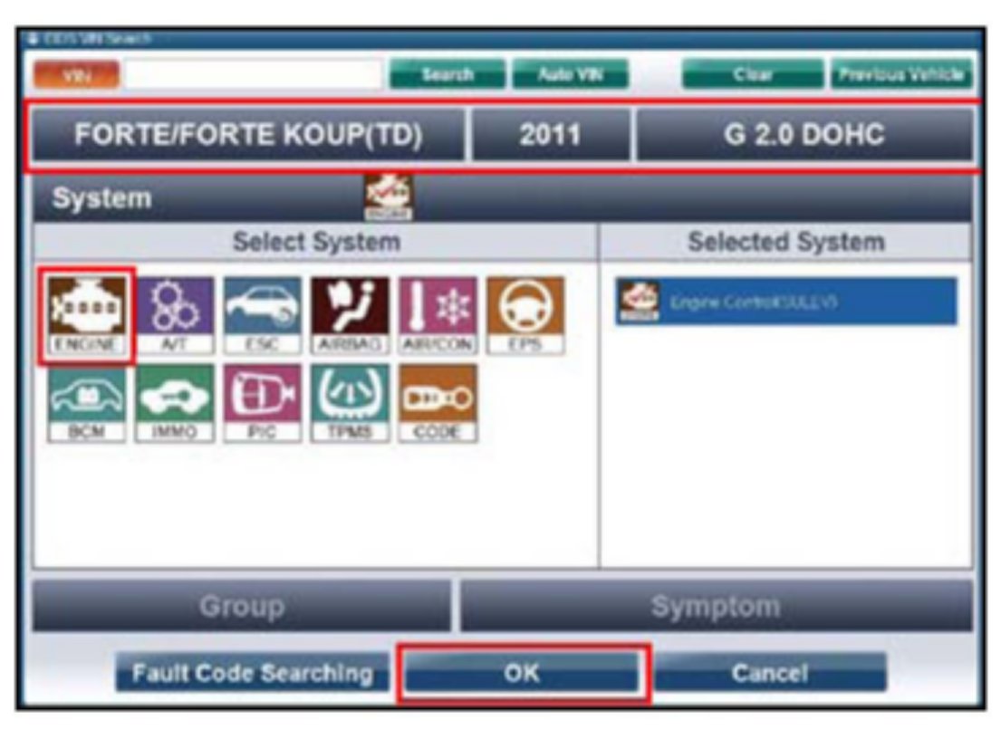 5. With the ignition key ON, turn ON the VCI and GDS tool. Access the GDS vehicle identification number (VIN) screen and configure the vehicle using the VIN AUTO DETECT Function.