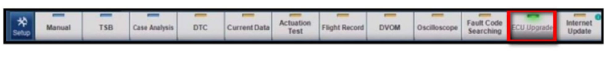 6. Once back at the GDS Main Screen, select ECU Upgrade from the bottom right-hand corner. Next select Auto Mode, and then Engine. Perform the ECM upgrade in accordance with normal GDS tool ECM upgrade procedures.