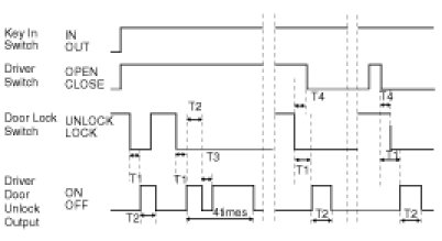 (2) DRIVER DOOR UNLOCK signal is output for T2 when TUNLOCK signal is received. But, all DOOR UNLOCK(Driver, Assist, Rear) signals are output for T2 if TUNLOCK signal is received within T1. (All DOOR UNLOCK(Driver, Assist, Rear) signals are output for T2 even when TUNLOCK signal in T1 Is received after changing DRIVER DOOR KEY UNLOCK SWITCH from OFF to ON.