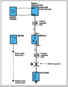 A short finder is available to locate a short to ground. The short finder creates a pulsing magnetic field in the shorted circuit and shows you the location of the short through body trim or sheet metal.