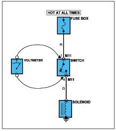 A. Connect one lead of a test lamp or voltmeter to a ground. If you are using a voltmeter, be sure it is the voltmeter's negative test lead you have connected to ground.